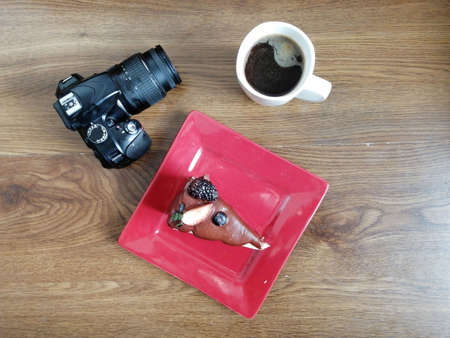 chocolate cake, camera and coffee. breakfast concept
