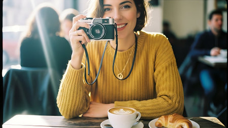Portrait of smiling young woman holding camera while having coffee in cafe