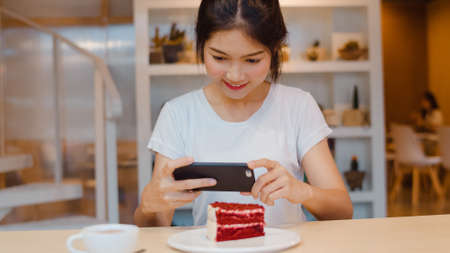 Food blogger Asian woman using camera for photo dessert, bread and drink while sitting on table in cafe. Lifestyle beautiful women relax at coffee shop concepts.