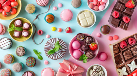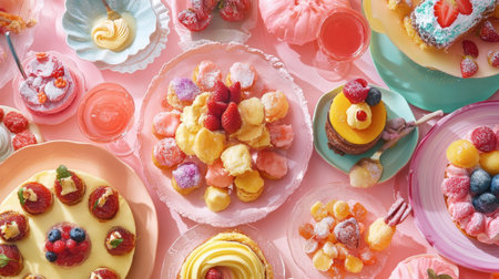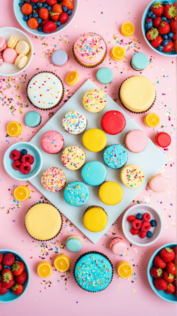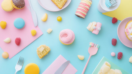 A variety of sweet treats, including cupcakes, colorful candies, and pastries, arranged on a bright pastel surface for a vibrant display.