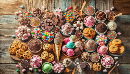 Overhead view of a dessert station showcasing vibrant ice cream scoops, cookies, and an array of toppings like sprinkles, marshmallows, and crushed pistachios. Various cookies and ice cream sandwiches are arranged neatly alongside bowls of candy and crunchy treats.