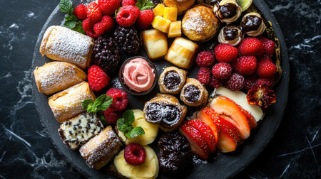 Top view of a gourmet dessert platter with assorted pastries and fresh fruit on a dark slate background