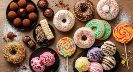 A delightful assortment of sweet treats is displayed on a rustic wooden table. The selection includes an array of colorful donuts with various toppings, chocolate truffles, lollipops, and macarons. The scene is vibrant and inviting, perfect for satisfying any sweet tooth.