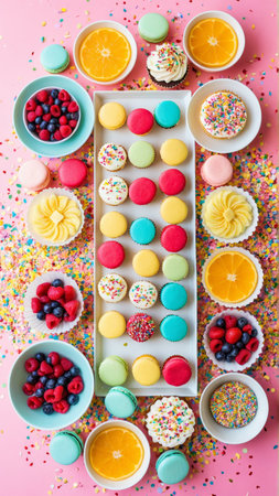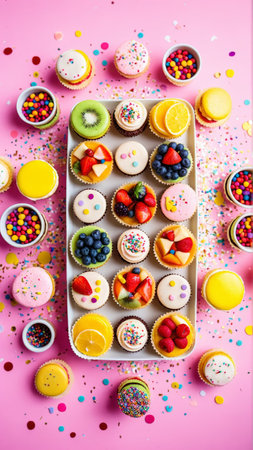 Overhead Shot of a Colorful Dessert Table with Cupcakes, Macarons, and Fruit Tarts
