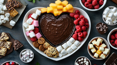 A heart-shaped platter with chocolate fondue in the center, flanked by assorted dipping items like cookies, fruits, and marshmallows.