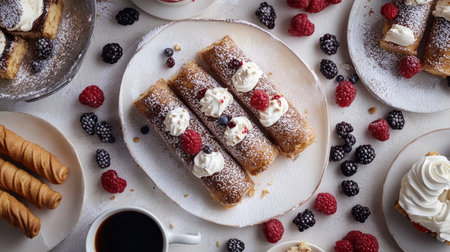 A beautiful flat lay of various Italian desserts, including tiramisu, cannoli, and panna cotta, arranged artfully on a table with coffee and berries.