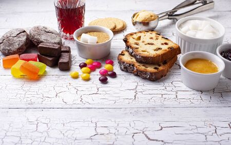 Unhealthy products high in sugar. Simple carbohydrates food.