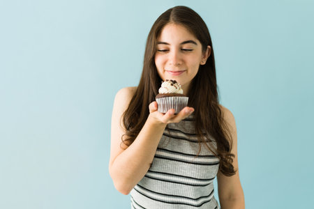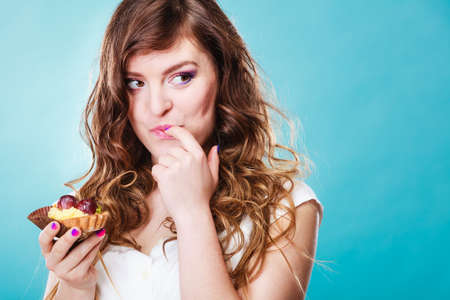 Woman holding sweet cupcake cake dessert with cream, she wants to eat it.