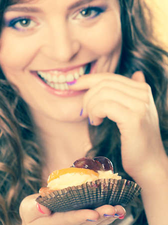 Food and sweets. Appetite and tasty meal dessert. Joyful woman with little cookie cupcake. Happy smiling girl eating small cake outdoor.
