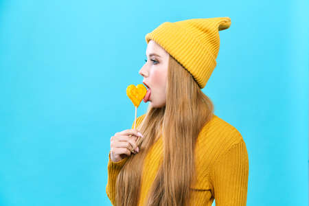 Summer Freestyle. Young woman with freckles standing isolated on blue licking lollipop close-up looking camera curious