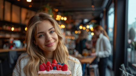A young blonde woman with a radiant smile is enjoying a delicious berry cake at a modern, cozy cafe. The background showcases a bustling atmosphere.