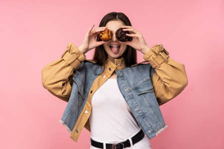 Photo of attractive lady covered eyes with muffins fun, wear casual jeans jacket white undershirt isolated pink color background