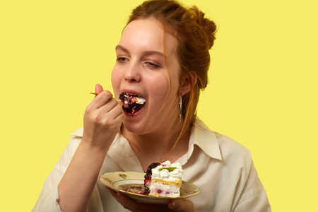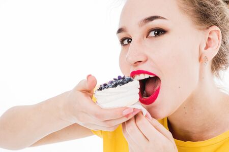 Young beautiful girl eating cake, in bright clothes on an white background.