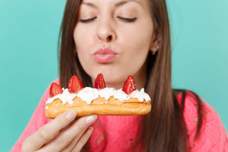 Cropped image of young woman in knitted pink sweater with closed eyes hold in hand, eating eclair cake isolated on blue wall background, studio portrait. People lifestyle concept. Mock up copy space
