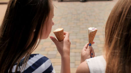 Portrait of nice attractive lovely pretty cheerful cheery dreamy girlish funny brown-haired girls eating icecream having fun isolated on bright vivid shine vibrant yellow color background