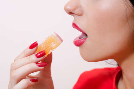 closeup image of glamor luxury sensual lady with seductive lips, white excellent teeth and red manicure nails eating jujube or candy on light copy space background