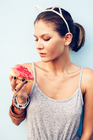 Brunette sexy woman holding tasty donut. Outdoors lifestyle portrait of pretty girl