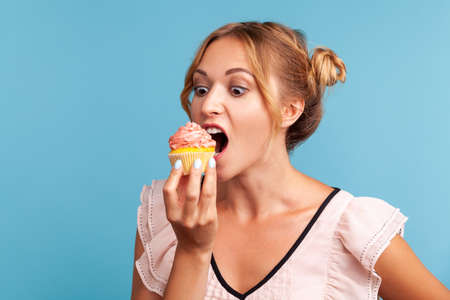 Sugar addiction. Portrait of hungry blonde young adult woman in dress biting delicious cake, looking with desire to eat sweet dessert. Indoor studio shot isolated on blue background.
