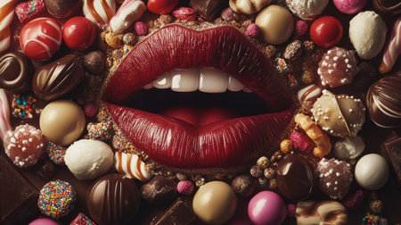 Artistic mouths surrounded by a swirl of candies and chocolates, showcasing the balance between indulgence and health awareness.