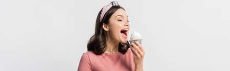 panoramic shot of joyful woman with open mouth holding cupcake isolated on white