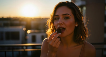 Woman enjoying dark chocolate praline on a city rooftop at sunset. Happy celebration on a summer evening terrace for food and leisure concept.