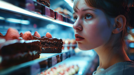 Girl sobbing upset can't eat junk food shows delicious glazed donuts want to, generative AI