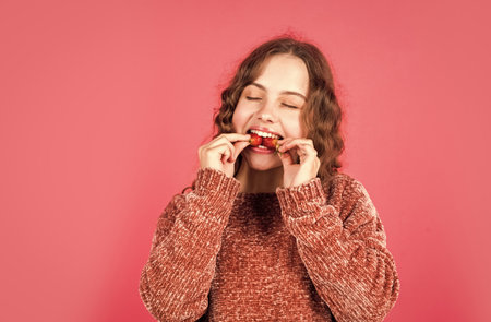 Portrait of attractive funny cute wavy-haired girl eating caramel good mood isolated over vivid teal turquoise color background