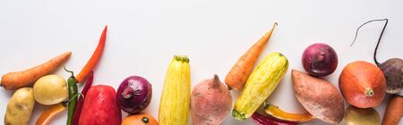 top view of colorful assorted fresh vegetables on white background, panoramic shot