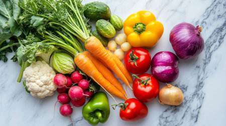variety of colorful vegetables spread on a marble countertop, generative ai
