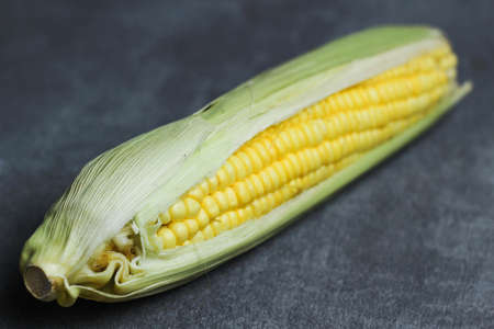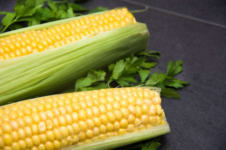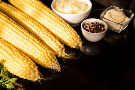 Raw sweet yellow corn on a dark table surface. Free space for text.