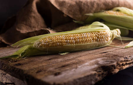 Fresh Raw Corn on Cobs on an old wooden table. Autumnal harvest still life background in a dark mood.