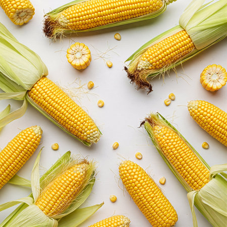 Fresh yellow corn with husks slightly pulled back, showcasing juicy kernels against white.
