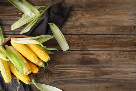 Top view of fresh corn on cobs on rustic wooden with Copyspace