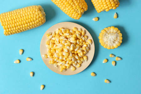 Corn cob on a blue background. Raw corn. Yellow cereal food. Harvesting cereals.