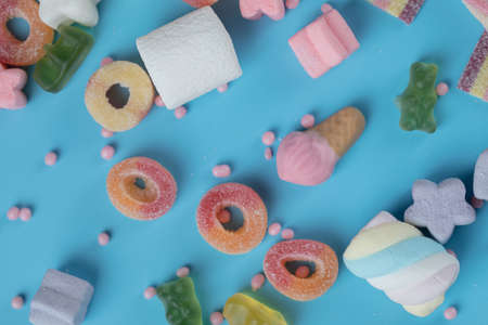 An assortment of colourful, festive sweets, blue marmalade in the shape of a heart on a blue background with a variety of caramels and candies, marshmallows. Abstract background. top view copy space.