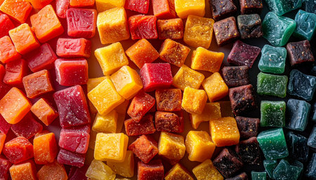 A vibrant, top-down macro view captures a colorful assortment of candy cubes. The rainbow spectrum of sweet, translucent gummies creates a playful and joyful texture, perfect for backgrounds related to celebration, childhood, and sweet indulgence.