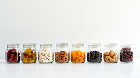 Organic bulk products in zero waste shop. Foods storage in kitchen at low waste lifestyle. Dried berries and fruits in glass jars on shelves. Eco friendly shopping in plastic free grocery store.