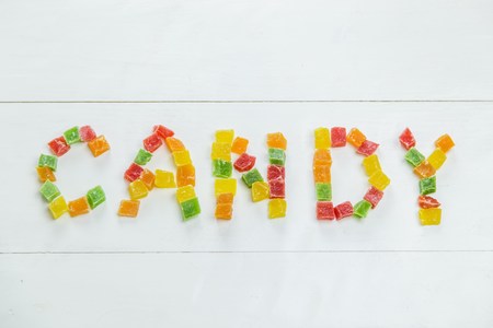 Colorful gummy candies piled against a vibrant rainbow backdrop