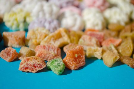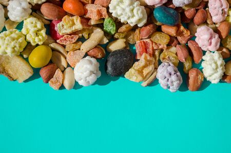 Assorted of sugared dried fruits, nuts and dragees in sugar, on a blue background with copyspace