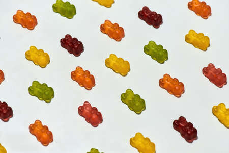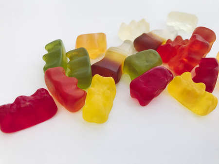 Closeup of colorful gummy bears jelly candies scattered diagonally isolated on white background