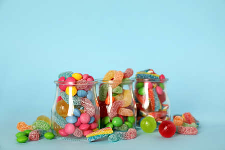 This captivating image showcases a colorful assortment of candy in jars, scattered on a light blue surface, perfect for conveying a sense of fun and sweetness.