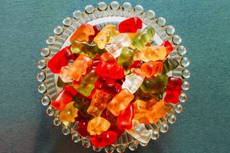 Mixed color gummy bears placed in a glass blow – Sweet and tasty treats with fruit flavor – Soft textured sugary candies