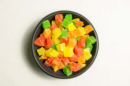 pieces of dried fruit on a black plate. candied fruits close-up in a plate on a light background