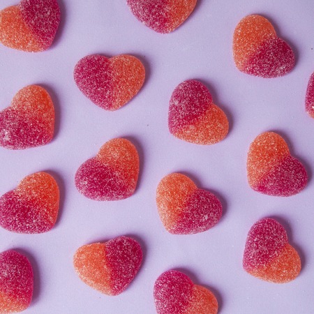 Valentine's day heart shape candy pattern on purple paper background. Concept of Valentine Day. Top view.