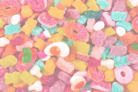 Rainbow juicy gummy candies background. top view. Jelly sweets.
