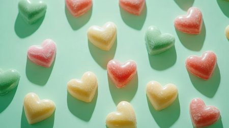 A playful arrangement of candy hearts on a pastel green background, symbolizing sweetness and love.