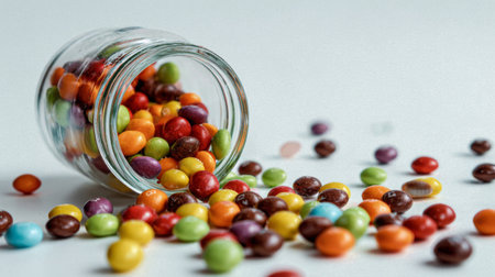 A glass jar vividly spills colorful candy onto a white surface, showcasing an assortment of bright sweets that evoke joy and sweetness for all ages.