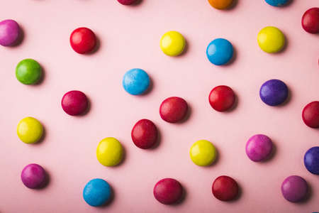 Directly above view of multi colored chocolate candies scattered over pink background. unaltered, unhealthy eating and sweet food concept.