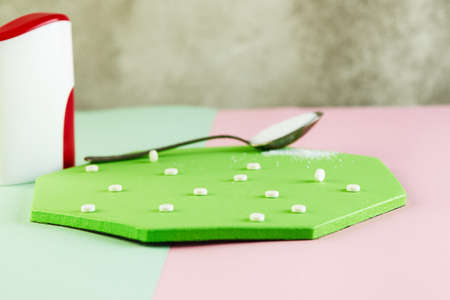 Sugar-replacing tablets with a spoon on a green and blue background.