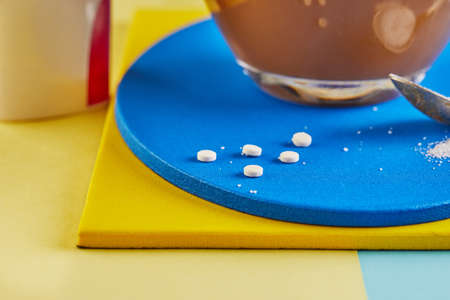 A cup of coffee and Pills of sugar substitute and natural sweetener in powder on a yellow and blue podium. Close up
